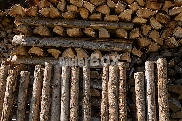 Beschreibung Österreich, Kärnten, Weissensee, Holzstoss mit geschnittenem Brennholz