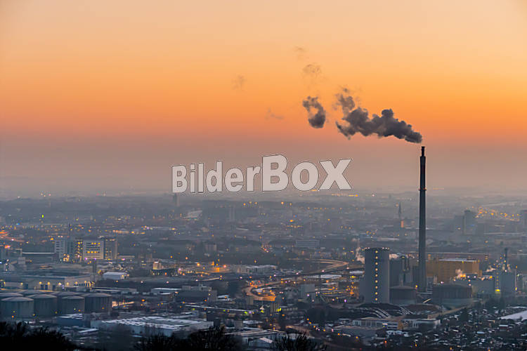 Beschreibung Rauchende Schlote in der Industriezone in Linz, Österreich, Oberösterreich