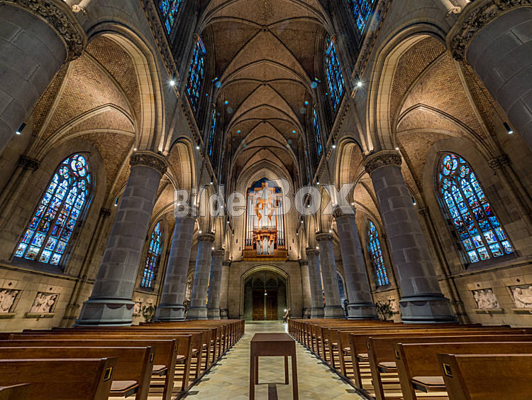 Beschreibung Innenaufnahme mit Glasfenster vom Mariendom in Linz, Österreich nach der Renovierung