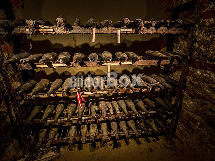 Beschreibung Österreich, Retz. Weinkellermuseum. Der Wein mit dem rot-weiß-roten Band wurde bei der Unterzeichnung des österreichsichen Staatsvertrages getrunken.