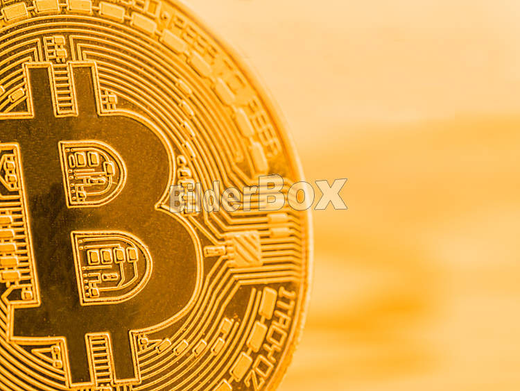 Beschreibung Physische Bitcoin Münze. Symbolfoto für digitale und virtuelle Währung