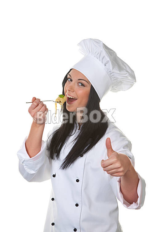 Beschreibung Junge Frau probiert ihr selbstgekochtes Nudelgericht aus