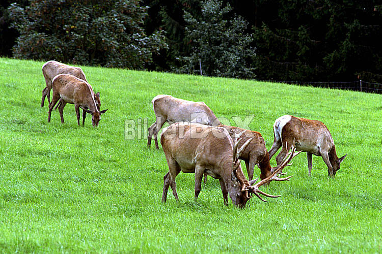 Hirsche (Kaukasushirsche) aesen auf einer Wiese