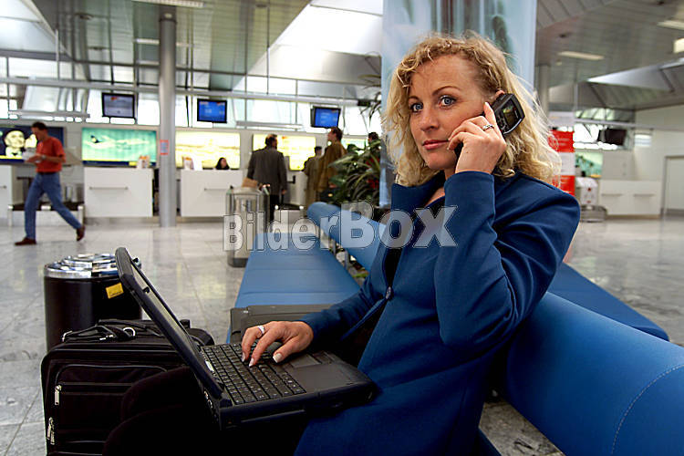 Frau mit Notebook und Handy auf Flughafen