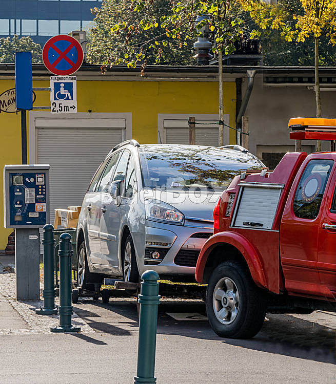 Beschreibung Ein falsch und verboten parkendes Auto auf einem Behindertenparkplatz wird abgeschleppt.