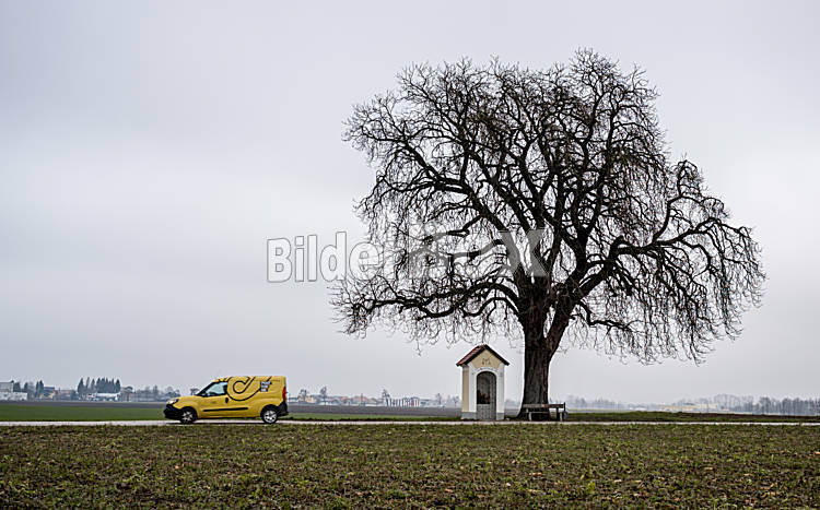 Beschreibung Alkoven, Österreich - 12/29, 2018: Zusteller der österreichischen Post liefert Pakete und Briefe aus.