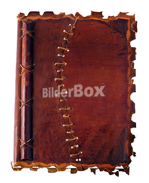 Beschreibung Ein altes Tagebuch oder Notizbuch mit einem Ledereinband. Liegt auf weißem Hintergrund.