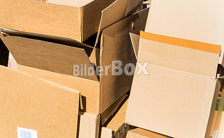 Beschreibung Leere Kartons von Verpackungen warten auf den Abtransport zur Altpapier Sammelstelle. Müllvermeidung durch okölogische Wiederverwertung