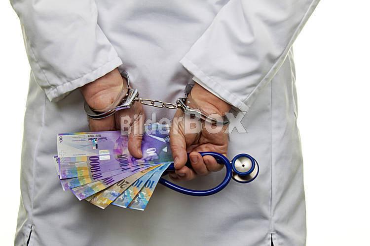 Beschreibung Ein Arzt mit Schweizer Franken Geldscheinen und Handschellen