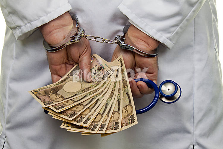 Beschreibung Ein Arzt mit japanischen YEN Geldscheinen und Handschellen