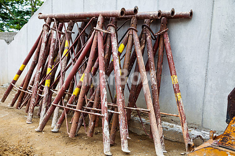 Beschreibung Baumaterialien und Werkzeuge stehen auf einer Baustelle herum