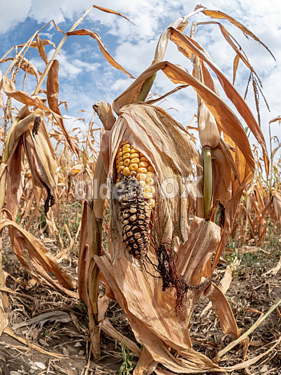Beschreibung Maisfeld mit Dürreschäden. Durch zu wenig Regen vertrocknen die Felder.