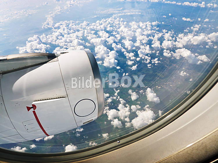 Beschreibung Die Aussicht aus einem Flugzeug Fenster. Über den Wolken.