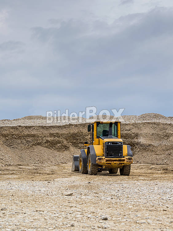 Beschreibung Bagger stehtb auf Baustelle. Ein neues Mehrparteienhaus wird gebaut.