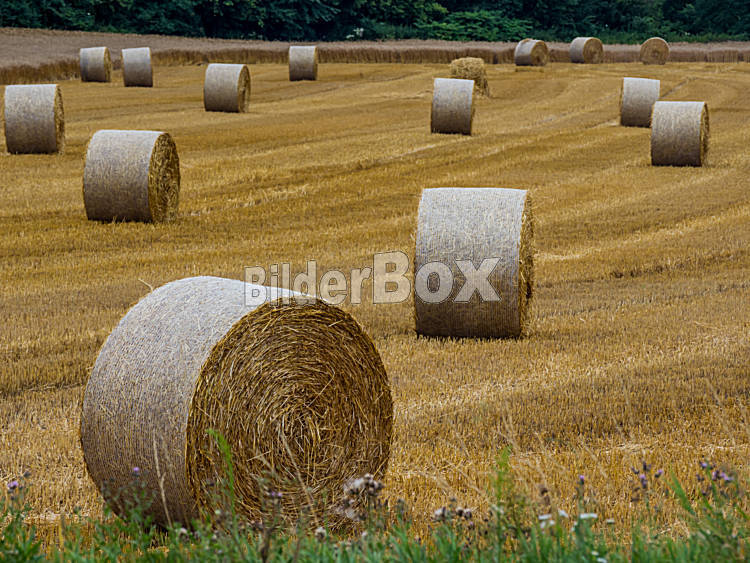 Beschreibung Strohballen liegen nach der Ernte auf einem Feld in der Landwirtschaft