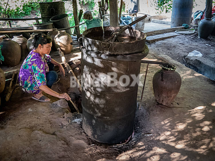 Beschreibung Ban Sang Hai, Laos - November 19, 2018: Frau brennt Schnaps im Schnapsbrenner-Dorf Ban Sang Hai. Es handelt sich um Reisschnaps mit bis zu 50% Alkohol. Zum Teil werden Schlangen, Skorpionen und...