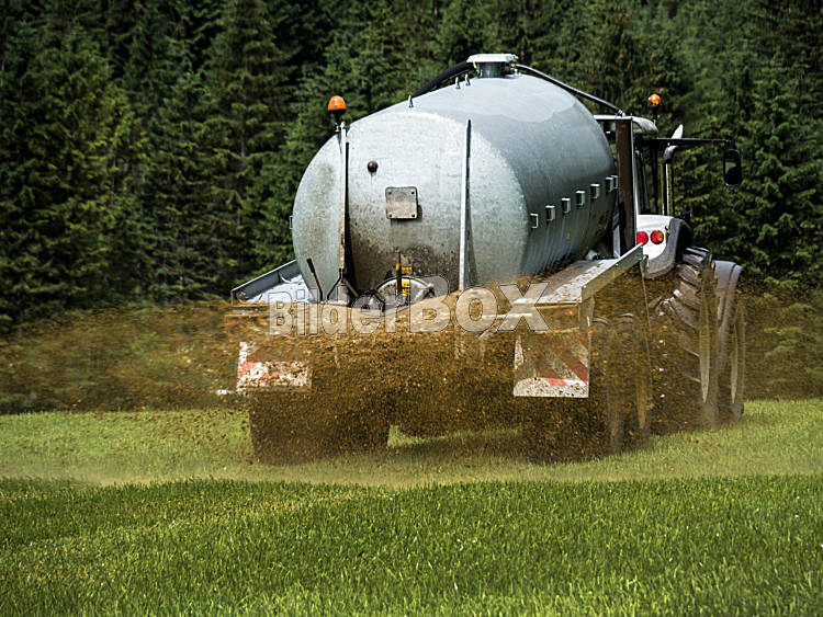 Beschreibung Ein Bauer fährt mit Gülle auf einem Feld zum Düngen