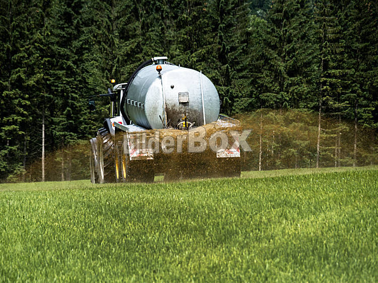 Beschreibung Ein Bauer fährt mit Gülle auf einem Feld zum Düngen