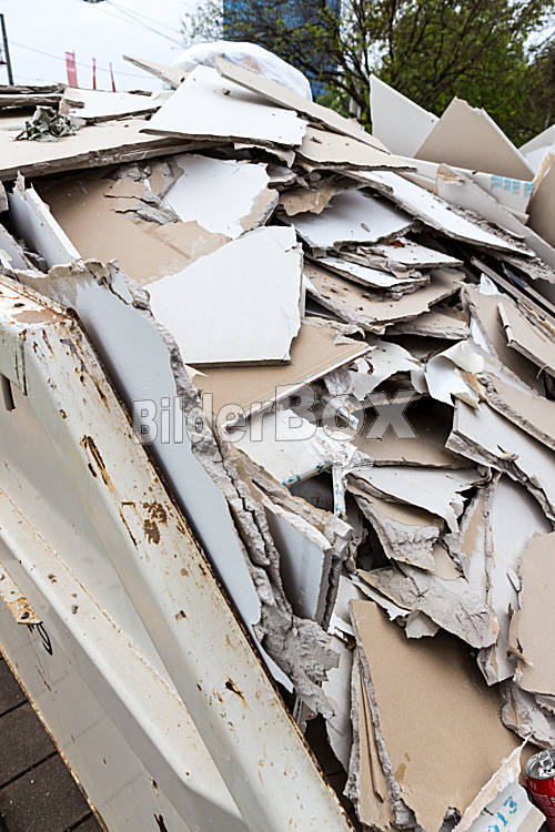 Beschreibung In einem Abfallcontainer lagern Platten aus Gipskarton für ihre Entsorgung
