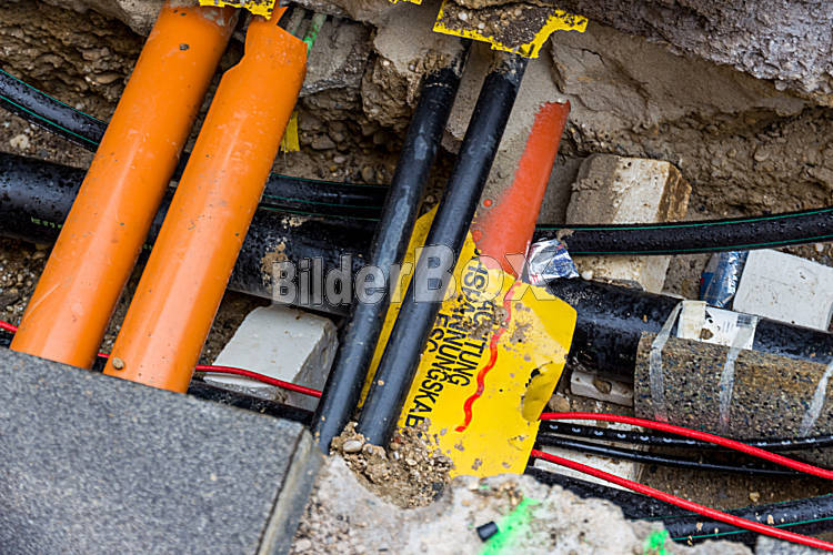 Beschreibung Auf einer Baustelle werden neue Leitungen für Wasser, Heizung, Fernwärme und Strom eingezogen. Baugrube mit Versorgungsleitungen