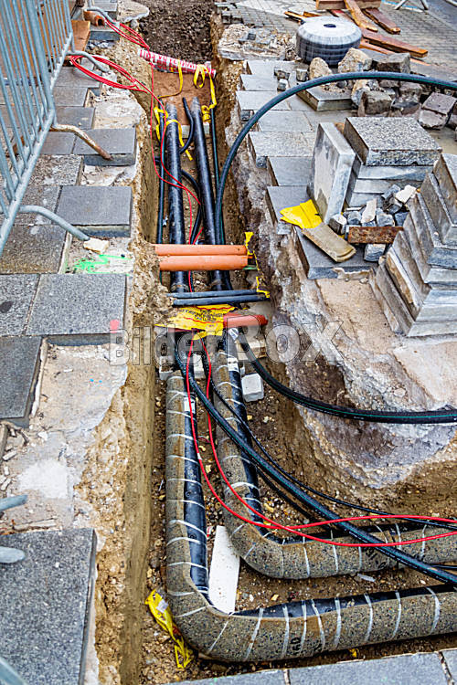 Beschreibung Auf einer Baustelle werden neue Leitungen für Wasser, Heizung, Fernwärme und Strom eingezogen. Baugrube mit Versorgungsleitungen