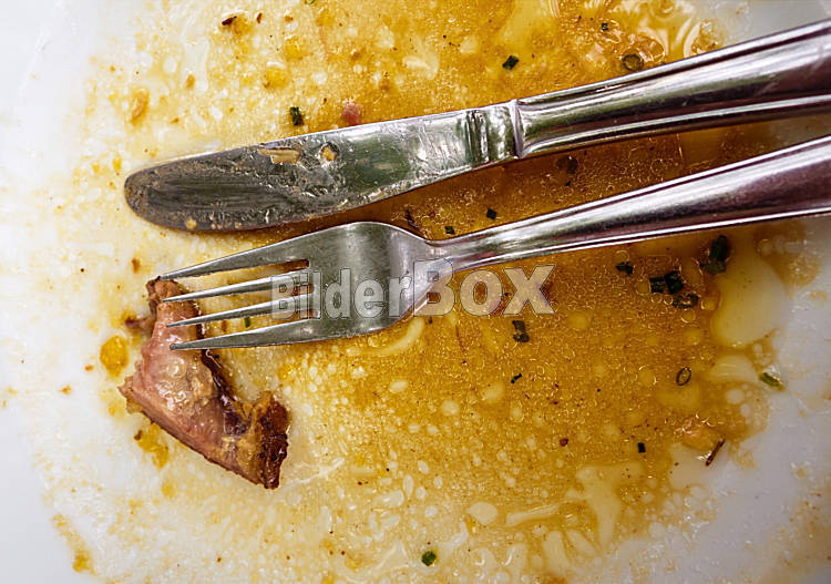 Beschreibung Ein Besteck liegt nach dem Essen auf einem Teller