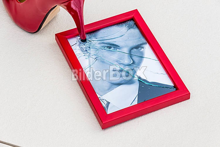 Beschreibung Zerbrochner Bilderrahmen und High Heels. Symbolfoto für Scheidung, Trennung und Beziehungskrise