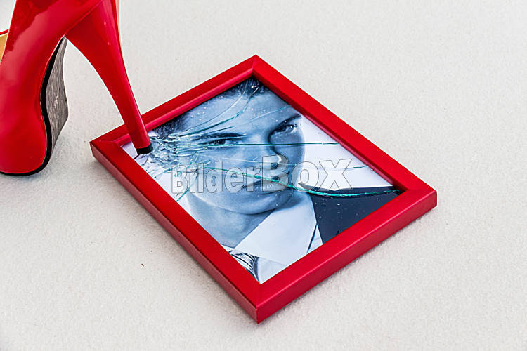 Beschreibung Zerbrochner Bilderrahmen und High Heels. Symbolfoto für Scheidung, Trennung und Beziehungskrise