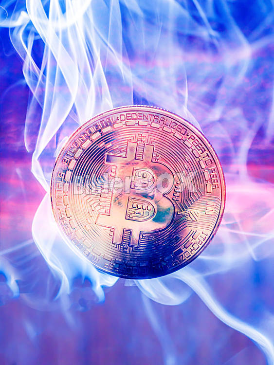 Beschreibung Eine physische Bitcoinmünze im Rauch. Kursprobleme bei digitalen Währungen