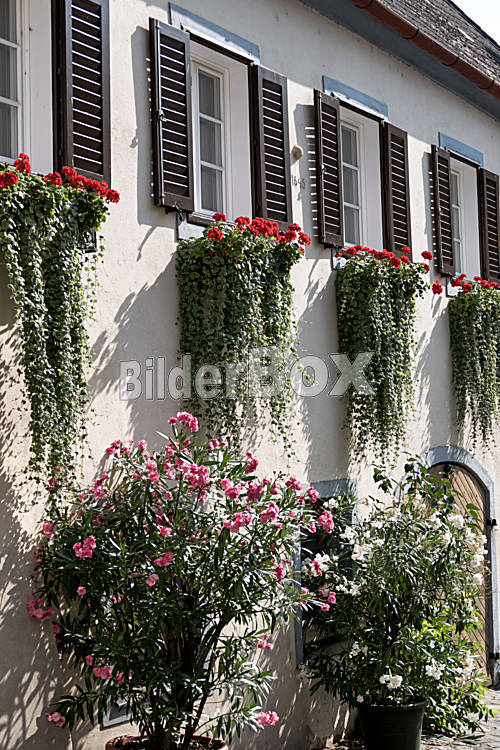 Beschreibung Schöner Blumenschmuck an einem Haus in Dürnstein, Wachau, Österreich