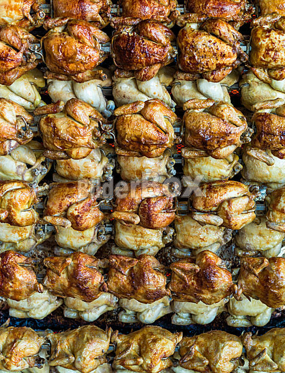 Beschreibung Viele Brathühner auf einem Grill bei einem Fest.