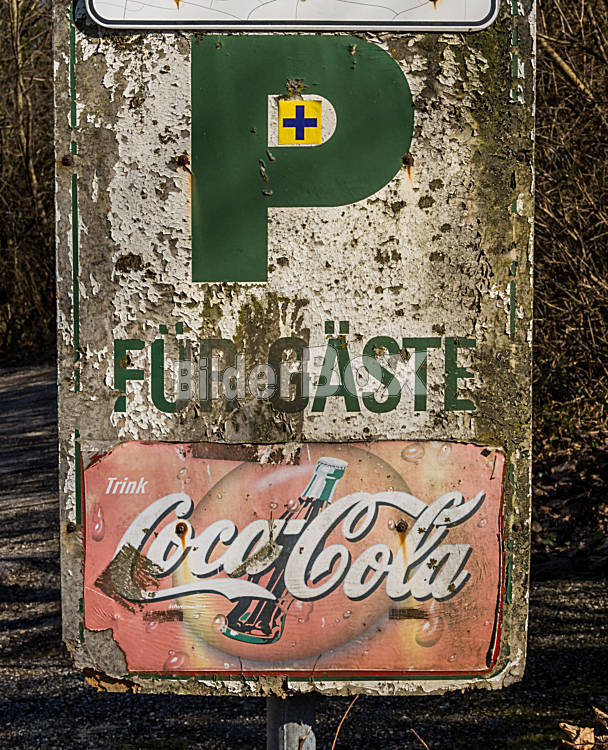 Beschreibung Altes Schild Parkplatz mit Coca Cola Werbung