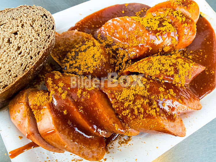 Beschreibung Eine Currywurst auf einem Schnell Imbiss Stand