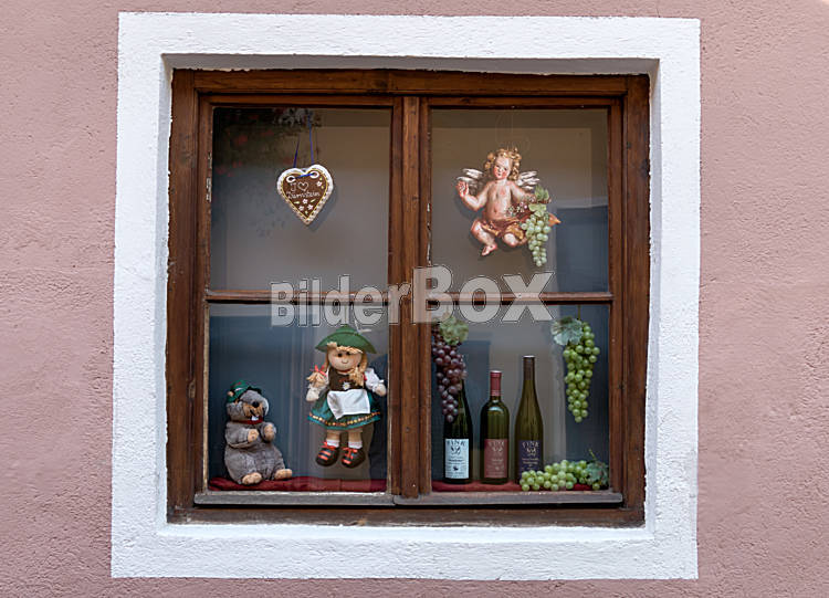 Beschreibung Ein Fenster mit Gegenständen in Dürnstein, Wachau, Österreich