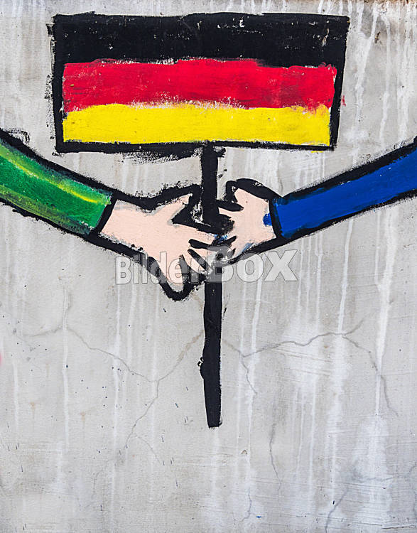 Beschreibung Deutsche Flagge als Graffiti auf einer Mauer mit Kinderhänden