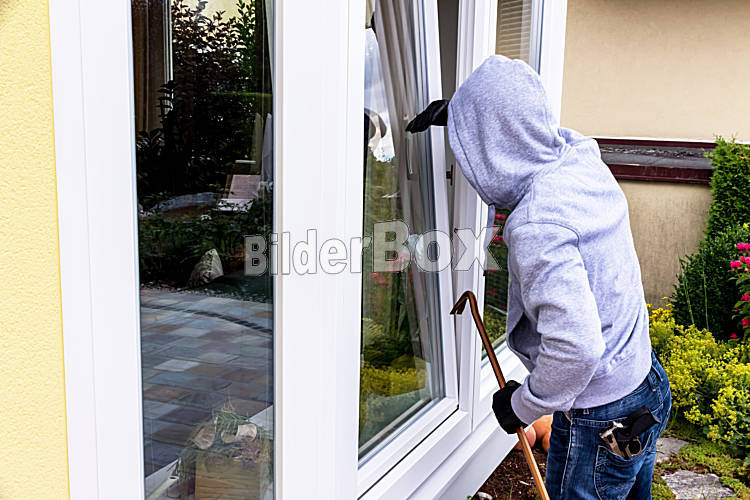 Beschreibung Ein Einbrecher versucht bei einem offenen Fenster mit einer Brechstange einzubrechen
