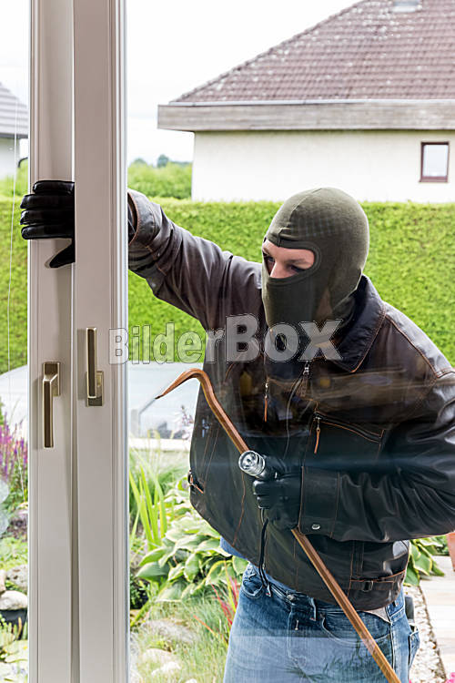 Beschreibung Ein Einbrecher versucht bei einem offenen Fenster mit einer Brechstange einzubrechen