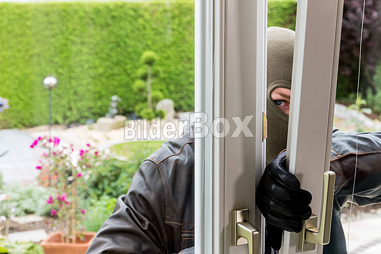 Beschreibung Ein Einbrecher versucht bei einem offenen Fenster mit einer Brechstange einzubrechen