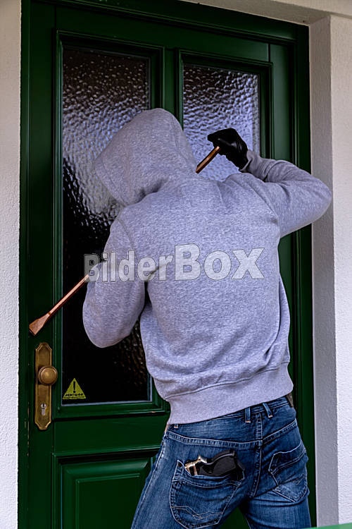 Beschreibung Ein Einbrecher versucht eine Haustür aufzubrechen.