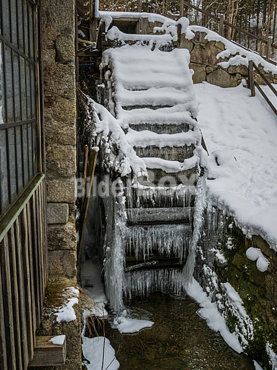 Beschreibung Eingefrorenes Mühlrad. Symbolbild für Energieausfall und Betriebsschließung und Kurzarbeit