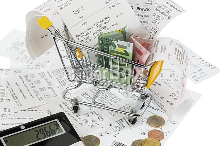 Beschreibung Einkaufswagen, Geldscheine und Kassenbons, Symbolfoto für Kaufkraft, Konsum und Inflation