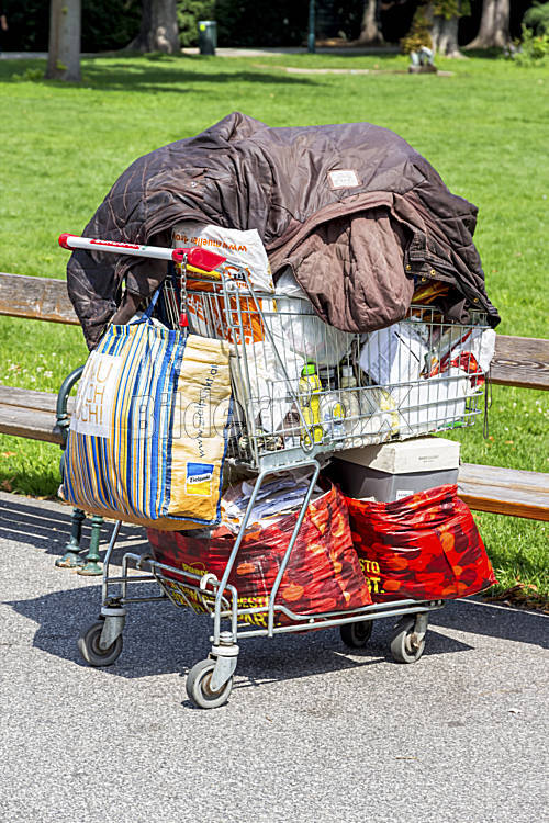 Beschreibung Einkaufswagen eines Obdachlosen, Symbol für Scheitern, Obdachlosigkeit, Randgruppe