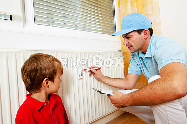 Beschreibung Monteur mit Heizkörper. Energie sparen. Ablesen der Heizungs - Einstellung.