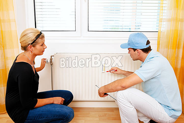 Beschreibung Monteur mit Heizkörper. Energie sparen. Ablesen der Heizungs - Einstellung.