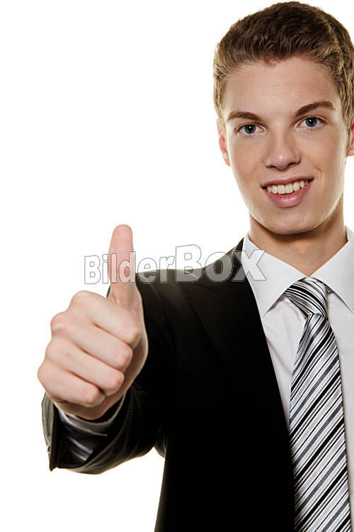 Beschreibung Ein erfolgreicher junger Mann hält Daumen hoch