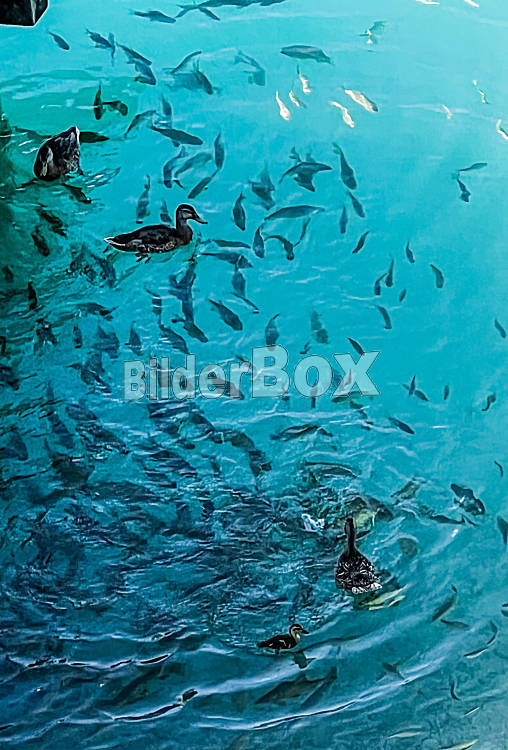 Beschreibung Fische und Enten im Wasser. Weissensee in Kärnten, Österreich
