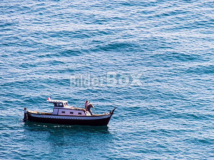 Beschreibung Fischerboot unterwegs auf dem Meer, Symbolfoto für Fischerei, Arbeitswelt, Schifffahrt