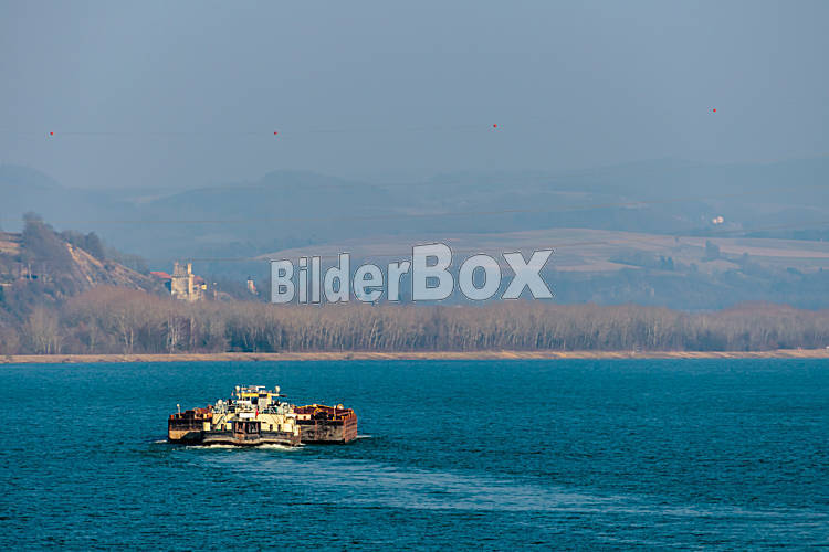 Beschreibung Frachter mit Schüttgut unterwegs, Symbol für Schifffahrt, Güterverkehr, Logistik, Export, Navigation