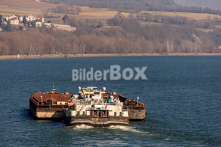 Beschreibung Frachter mit Schüttgut unterwegs, Symbol für Schifffahrt, Güterverkehr, Logistik, Export, Navigation