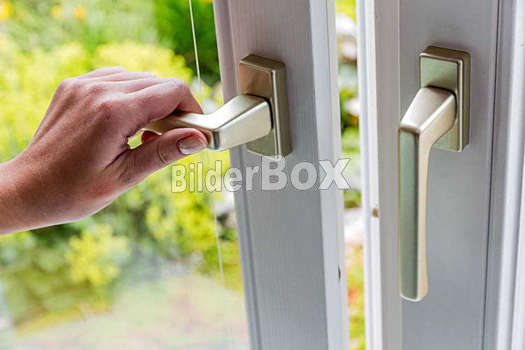 Beschreibung Eine Frau öffnet ein Fenster zum Lüften der Wohnung. Frische Luft im Zimmer